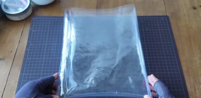 Вставьте декоративные вкладыши в прозрачный футляр сумки. Заверните края футляра внутрь и зажмите их прищепками. Оставьте на 10-15 минут, а затем запаяйте края горячим утюжком.