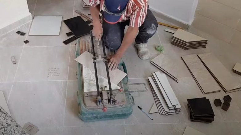 По ранее сделанной разметке при помощи болгарки прорезаем контуры. Потом демонтируем старую плитку.