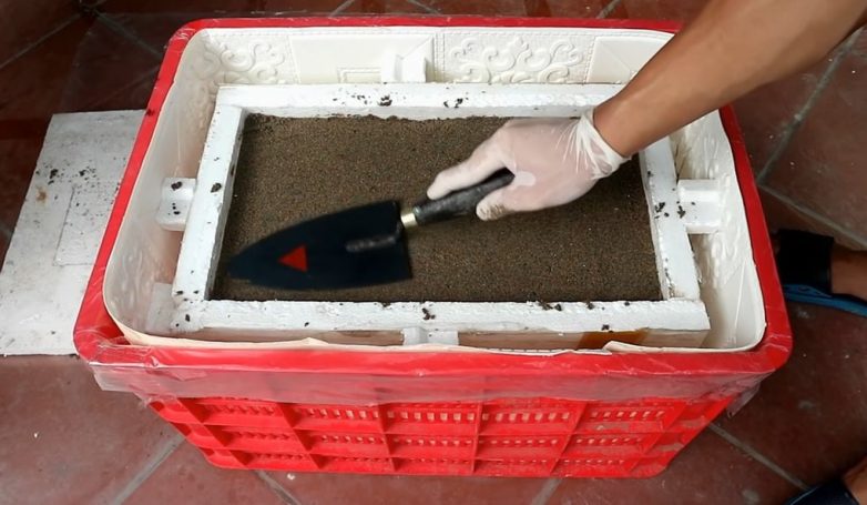 Поместите пенопластовый ящик в основной ровно посередине. Для фиксации его внутри ящика используйте прямоугольники из пенопласта. Насыпьте внутрь песок, не доходя несколько сантиметров до верхнего края ящика, и хорошо утрамбуйте его.