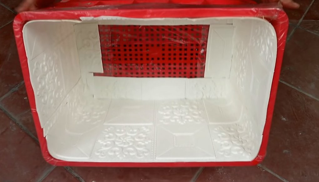 Соберите из пенопласта ящик со сторонами на 3-4 см меньше сторон внутренней части основного ящика. Для соединения частей пенопласта между собой удобнее всего использовать жидкие гвозди.