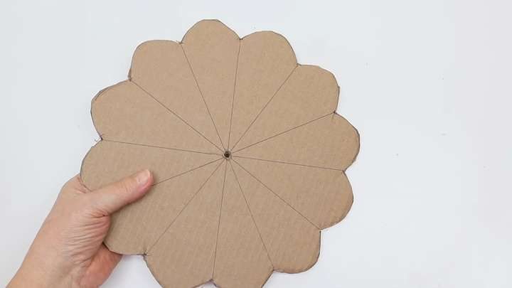 Теперь соберём декоративную часть подставки. Из картона вырежем круг и разделим его на 12 частей. Каждую часть закруглим. В центре также сделаем отверстие. Приклеим сверху мешковину.