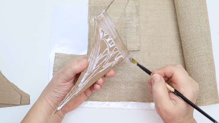 Далее из картона вырежем углы 10*18*2 см. Приклеим на них мешковину.
