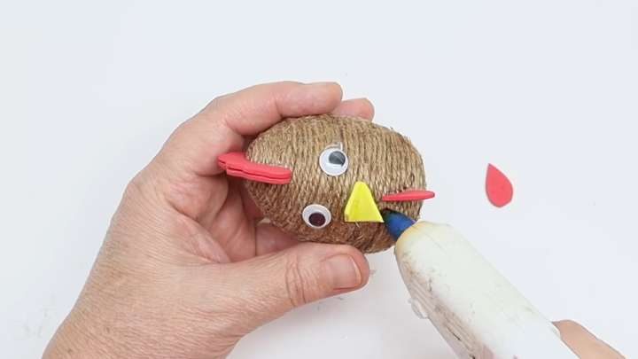 Из пенопластового шара, джута и фоамирана сделайте голову курочки.