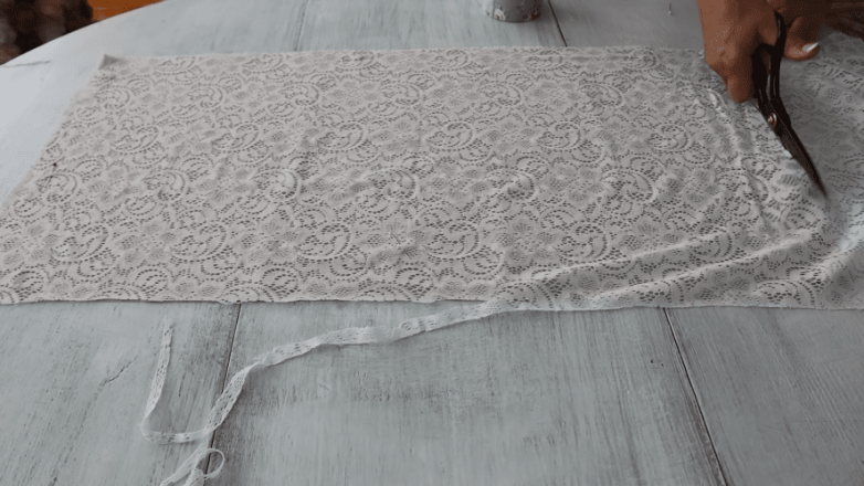 Из остатков подходящей ткани и старого тюля вырезаем по одному прямоугольнику размером 40х80 см. Совмещаем полотна между собой, дополнительно скалываем портновскими булавками, а затем прострачиваем по периметру.
