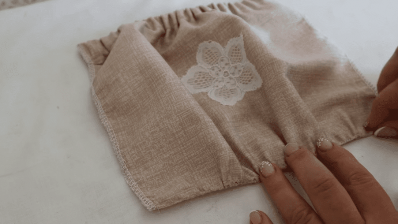 Вырезаем из тюля подходящий фрагмент. Пристрачиваем к карману по лицевой стороне. Обрабатываем бока. Сверху вставляем резинку. Снизу аккуратно стягиваем ткань и делаем сборку.
