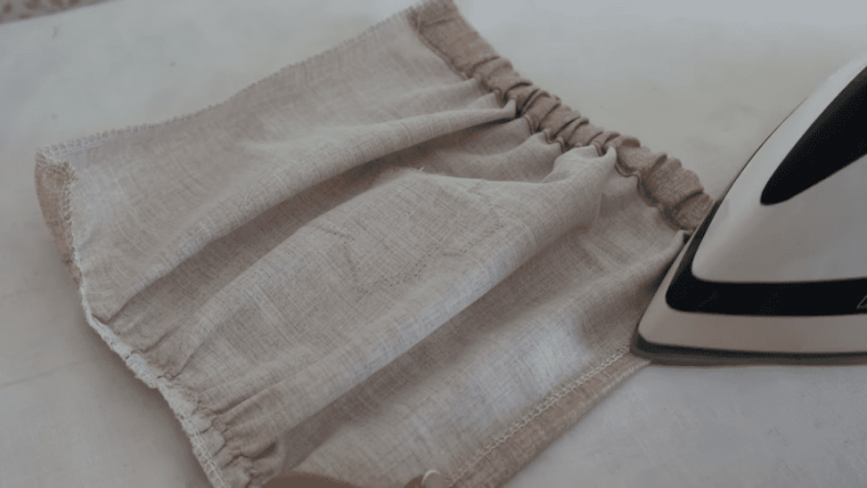 Из основной ткани вырезаем квадрат 30х30 см. Отмеряем 20 см широкой резинки. Верхний край загибаем и заглаживаем с таким расчетом, чтобы сделать туннельку под резинку. Застрачиваем подвернутую ткань. При необходимости подравниваем высоту кармана. Делаем загиб с противоположной стороны. Заутюживаем линию сгиба, затем убираем подворот и дважды прокладываем строчку с максимальной длиной стежка вдоль линии сгиба, чтобы чуть позже сделать сборку.