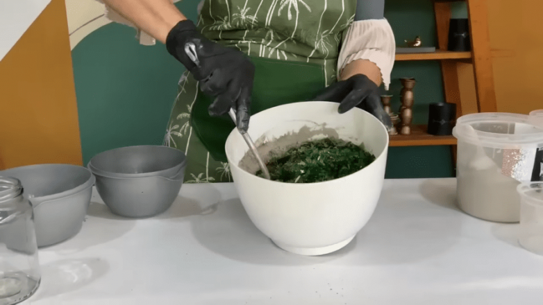 Излишки цемента возвращаем в емкость для замеса, туда же добавляем 1 часть битого стекла и немного воды, чтобы получить не такой густой раствор. Затем все тщательно перемешиваем.