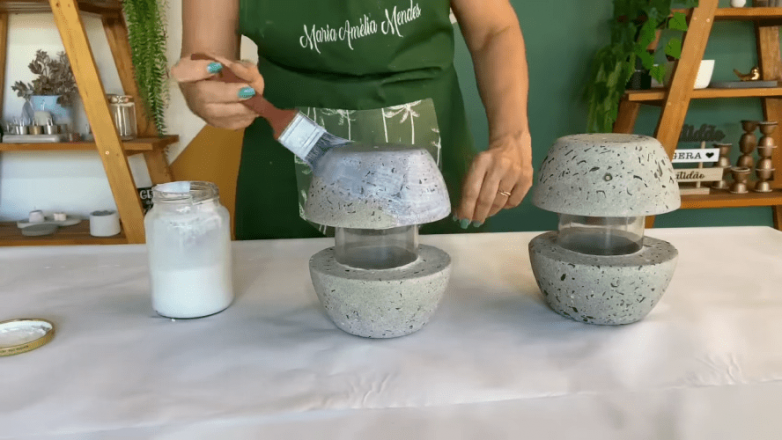 Для реализации этой идеи понадобится пара обычных стеклянных банок и несколько бутылок из цветного стекла. Запастись нужно будет также цементом и песком. Все остальное – дело техники. В качестве формы использованы пластиковые миски подходящего размера.