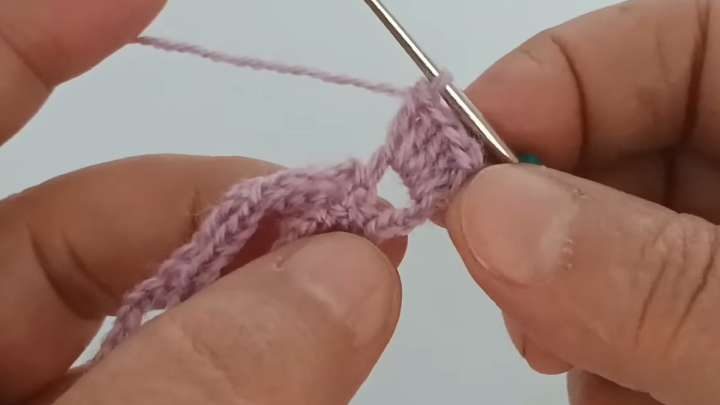 Затем снова перейдите на предыдущее кольцо в ряду, обвяжите 5 столбиками без накида. Сделайте то же самое со следующим кольцом. После второго кольца в петлю между кольцами провяжите 2 воздушные цепочки из 3 петель, соедините их, вытяните пряжу и присоединитесь вязанием к верхней точке последнего лепестка, связанного ранее. Сделайте одну воздушную петлю. Вновь обвяжите 6 столбиками с накидом.