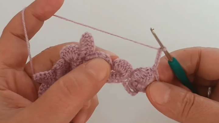 Когда закончится ряд, поднимитесь на одну воздушную петлю подъёма и повторите первый ряд: 5 воздушных петель, присоединение к самой верхней петле цветка.