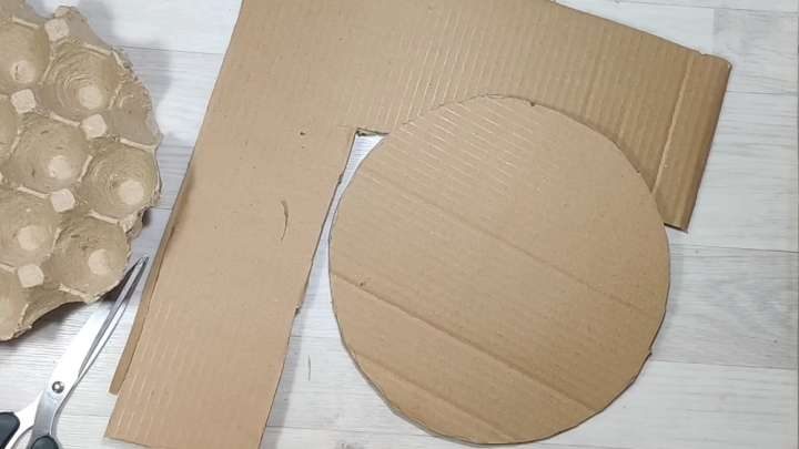 Возьмите большую плоскую тарелку и яичный лоток на 30 яиц. Вырежьте по контуру. Также с помощью этой же тарелки вырежьте круг из картона.