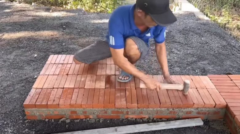 Размечаем участок, после чего выкладываем «бордюр» из кирпича. Заполняем пространство щебнем и уплотняем его трамбовкой, полив водой.