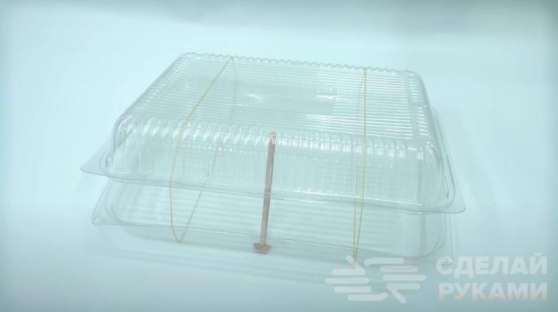 Берем пищевой пластиковый контейнер требуемого размера (он должен быть обязательно с крышкой) и надеваем на него две резинки, как показано на фото ниже.