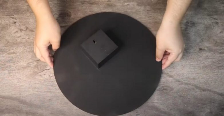 На следующем этапе необходимо будет покрасить диск с двух сторон. Автор использовал черный цвет, однако вы можете покрасить в любой другой цвет краски, который подходит под интерьер помещения.