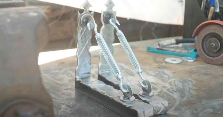 Для этого с помощью болгарки мастер сделал на заготовках надрезы в разных направлениях. На стойках кронштейнов автор вырезал наконечники.