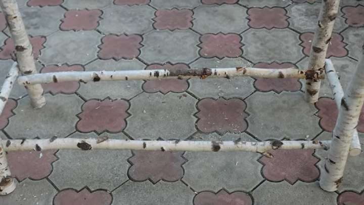 Выберите 4 самые толстые ветки — это будут ножки. Подпилите до одинакового размера. Соедините их снизу четырьмя ветками потоньше.