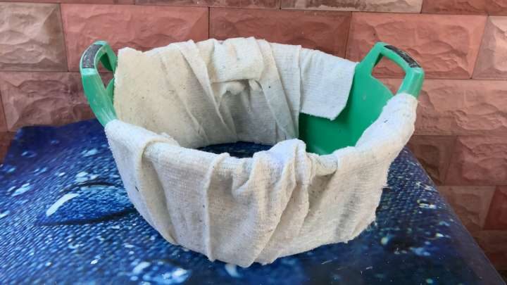 Вырежьте дно у пластикового тазика. Также возьмите тряпку подходящего размера, чтобы можно было обернуть стенки таза.