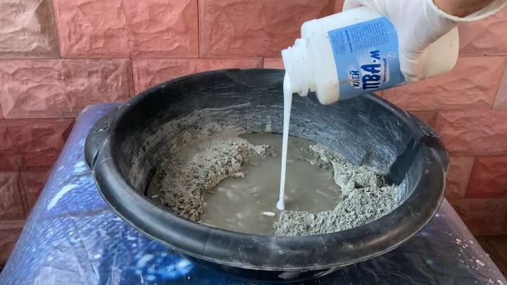 Из цемента, воды и небольшого количества клея ПВА замесите жидкий раствор.