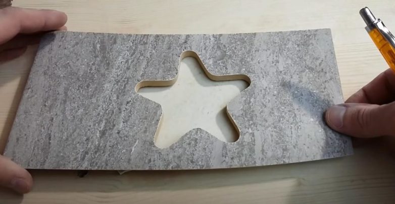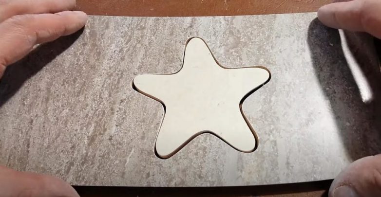 После этого переворачиваем плитку и вырезаем звезду ручным электролобзиком. Этот способ хорош тем, что на лицевой поверхности не будет никаких сколов.