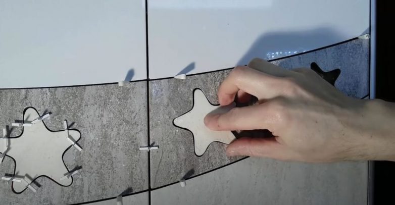 В основной плитке, которая будет крепиться к стене и является частью рисунка, получилось посадочное место для звезды. Саму звезду вырезаем из плитки другого цвета.