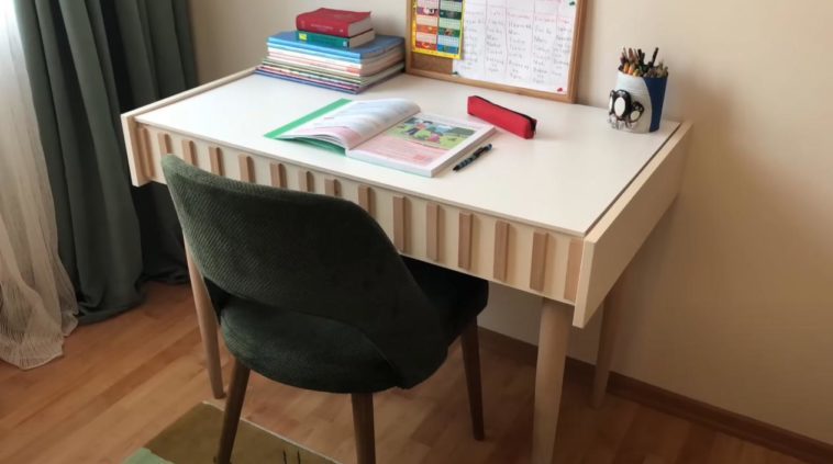 Потом закрашиваем белой краской кромку столешницы из ЛДСП и письменный стол готов. Процесс сборки смотрите в авторском видеоролике ниже.