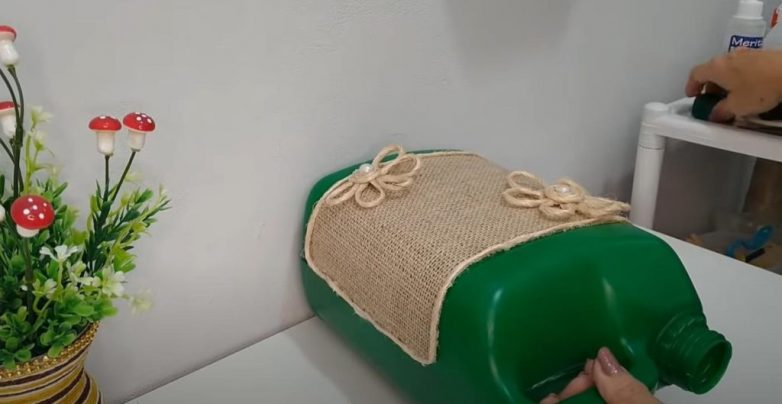 К одной из половиной канистры (с наружной стороны) приклеиваем мешковину и делаем по контуру окантовку из веревки. К мешковине при желании можно приклеить какой-нибудь декор.