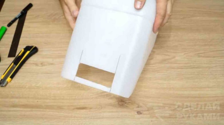 На следующем этапе необходимо будет прорезать прямоугольные «окна» в верхней части половинок пластиковой канистры.