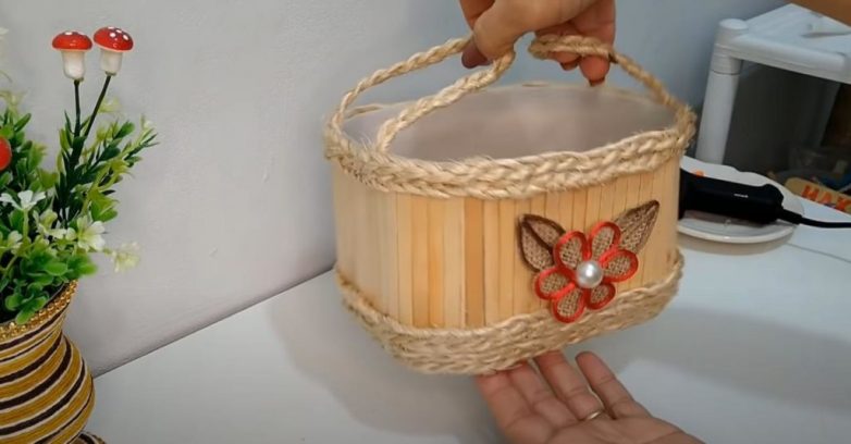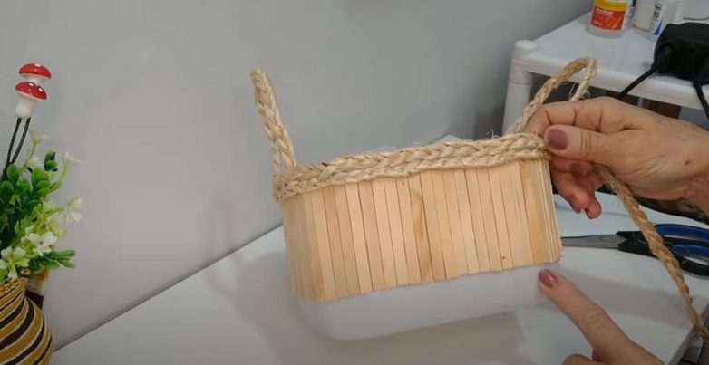Далее нам потребуется веревка. Сначала приклеиваем по бокам корзинки две ручки, затем по контуру приклеиваем на термоклей окантовку из веревки.