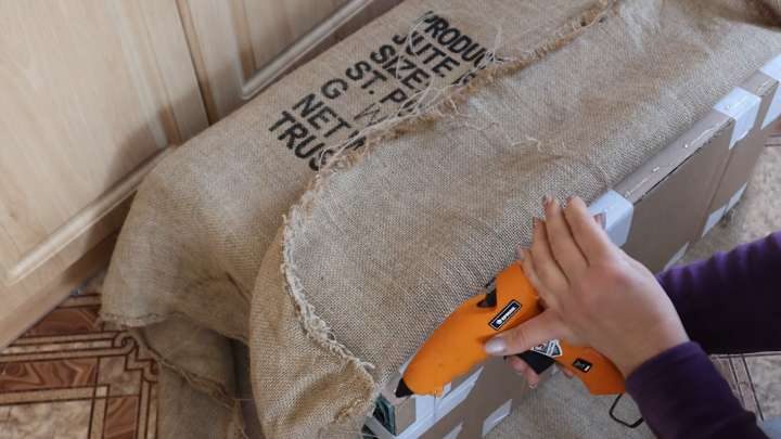 Сверху приклейте мешковину, чтобы закрыть картон.