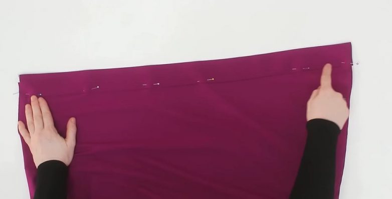 Одну из коротких сторон застрочите. Получившуюся планку пришейте к переднему полотнищу юбки.