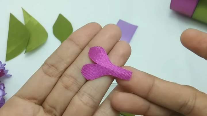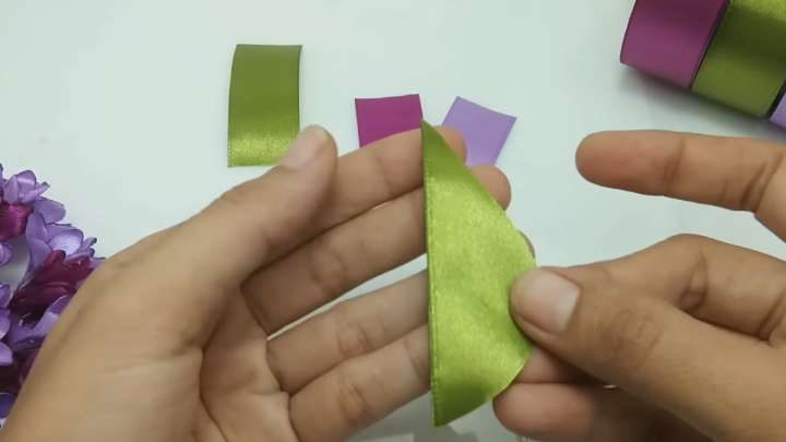 Нарежьте ленты на такие кусочки: зелёную на полоски 2,5*14 и 2,5*6 см, а сиреневые на кусочки 2,5*3 см.