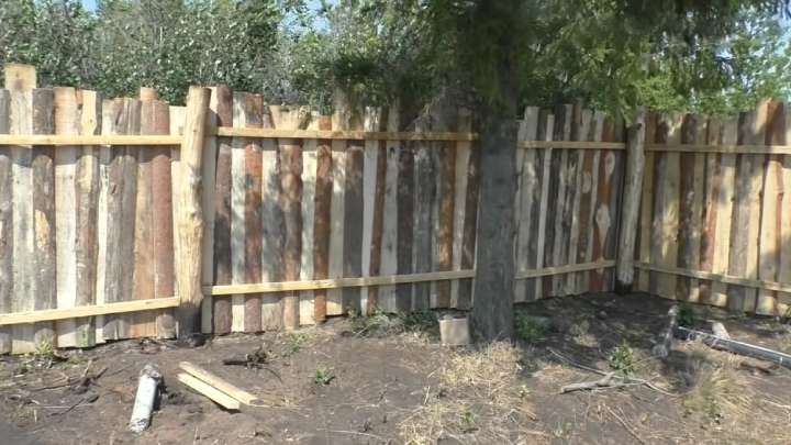 Наконец, осталось наглухо закрыть забор. Один из самых недорогих материалов — сосновый горбыль. Он и смотрится естественно, и стоит недорого. Простой, очень бюджетный, самобытный забор на участок готов!