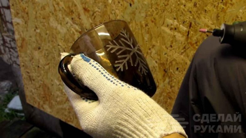 На следующем этапе нужно включить электрический гравер, и можно приступать к гравировке по рисунку трафарета. Это не обязательно должна быть снежинка — вы можете использовать любой другой рисунок на ваше усмотрение.