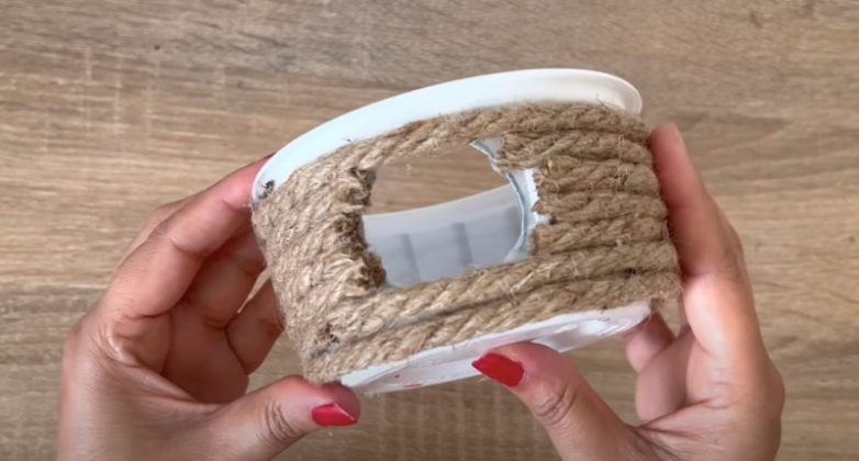 При желании каждый контейнер можно оформить так же, как и крышки. В верхней части каждого контейнера сделайте отверстие, в боковой и нижней частях проделайте несколько дренажных отверстий.