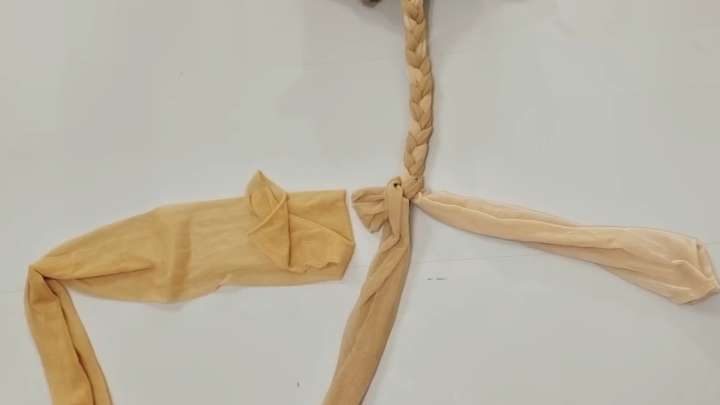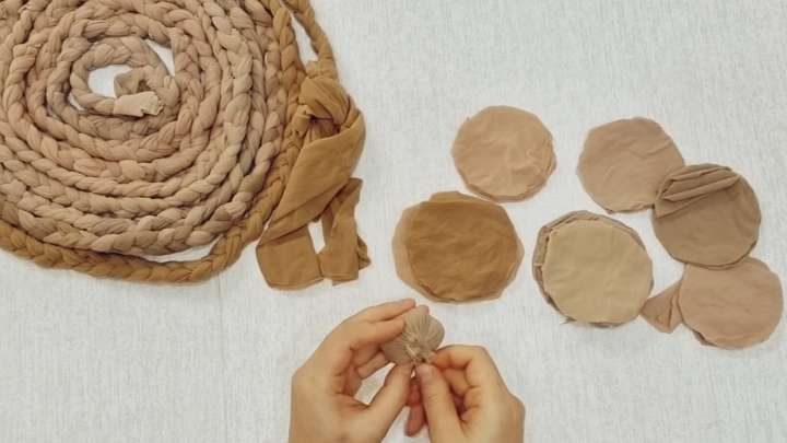 Должна получиться довольно длинная косичка. Из остатков колготок вырежьте круги, внутрь поместите небольшой кусочек синтепона, завяжите, сделайте мягкие шарики.