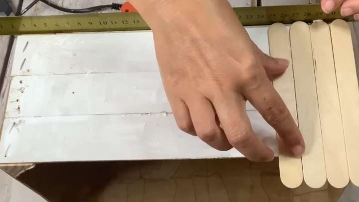 Затем возьмите палочки для мороженого, приклейте снаружи стенок ящика.