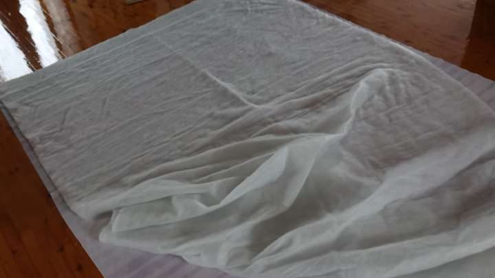 Из хлопковой ткани вырезать два равных полотна размером 155х205 см. Также приготовить синтепон. Хорошо разгладить ткани, межд и положить синтепон.