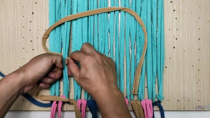 Теперь к каждому гвоздю снизу привяжите по трикотажной полоске. Одну за другой завязывайте узел, ряд за рядом.