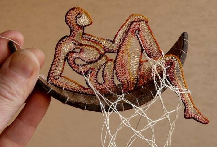 Последним шагом всегда является прикрепление кружева к ветке стежками или к любому другому материалу, из которого состоит каркас. Если художница использует в композиции кусочки коры, она должна хорошо подготовиться. Изначально вырезается форма. Затем производится шлифовка, полировка и покраска. И конечный этап – крепление стежками в нужном месте. Это одна из самых сложных задач, поскольку Агнес должна выполнить этот шаг на готовом кружеве после того, как удалит плотный бумажный фон.