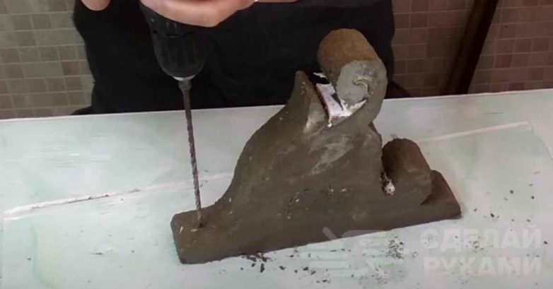 После застывания цементного раствора разбираем форму и извлекаем деталь. Это у нас получился кронштейн для фонаря. Сверлим в нем отверстия для крепления к стене.