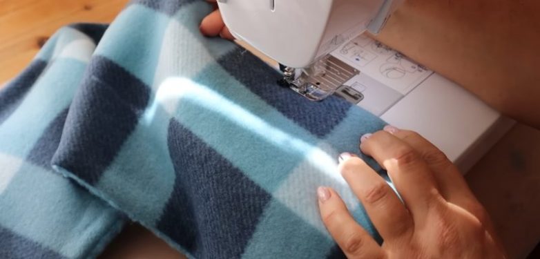 Сколите детали из пледа и из шарфа между собой лицевыми сторонами внутрь и сострочите их на швейной машине, оставляя небольшой открытый участок на одной из коротких сторон. Выверните заготовку на лицевую сторону и зашейте отверстие вручную.