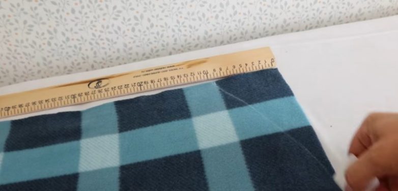Вырежьте из пледа полосу размером 82 см на 21 см. Отметьте от края 10 см и проведите плавную линию, к нижнему углу полосы.