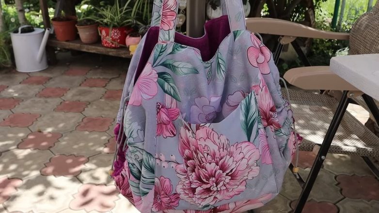 Из лоскута хлопчатобумажной ткани размером 25 см на 30 см сшейте карман. Пристрочите кармашек, отступив от верхнего края сумки 10 см.