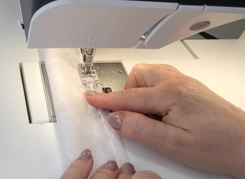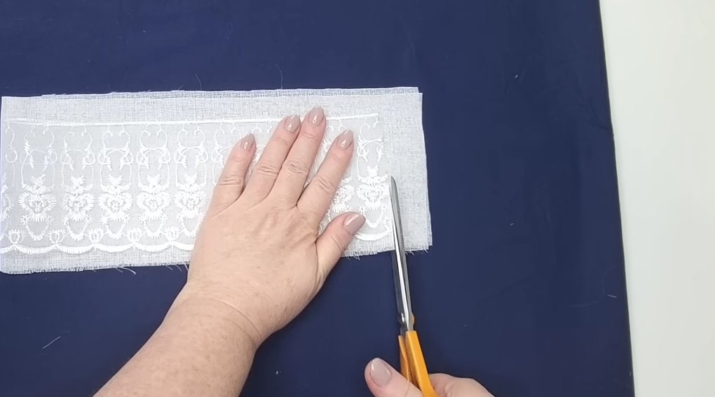 Сострочите ткани вместе. Сложите заготовку пополам так, чтобы кружевная сторона была обращена внутрь, и проложите еще одну строчку, не захватывая при этом фестончатый край кружева.