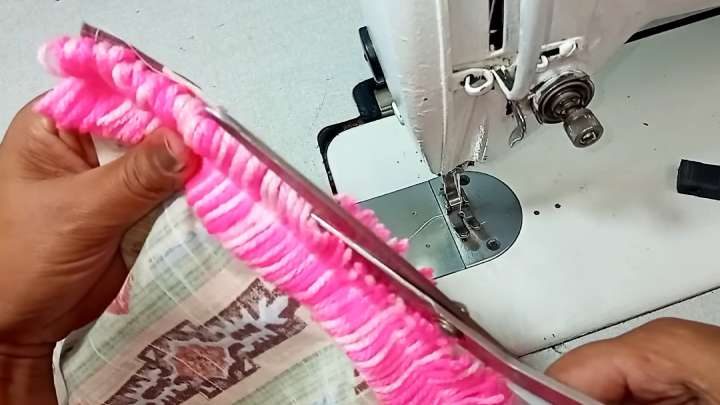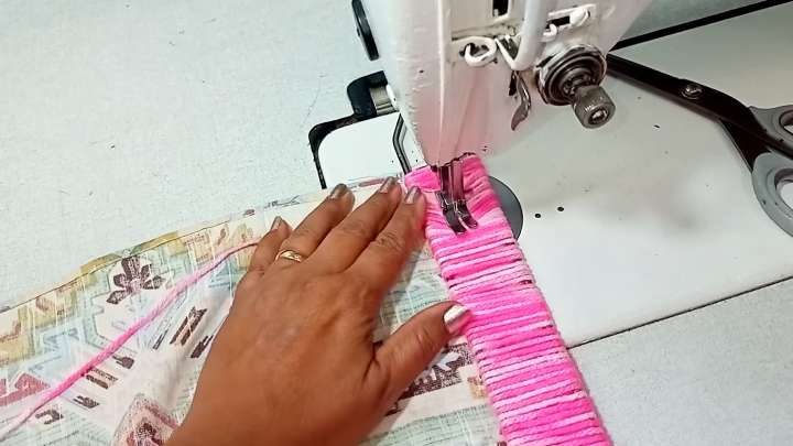 Подолжите ткань под низ, сверху установите пряжу с проволокой. Прошейте на машинке, пришивая пряжу к основанию (ткани).