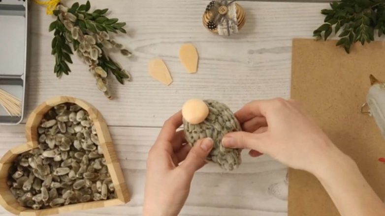 Отдельно заклейте почками вербы ушки, приклейте их к голове.