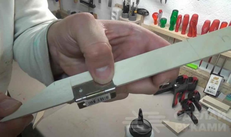 На последнем этапе останется только изготовить ручку — она состоит из двух частей, которые соединены между собой при помощи петли. Крепим ручку к дверце.