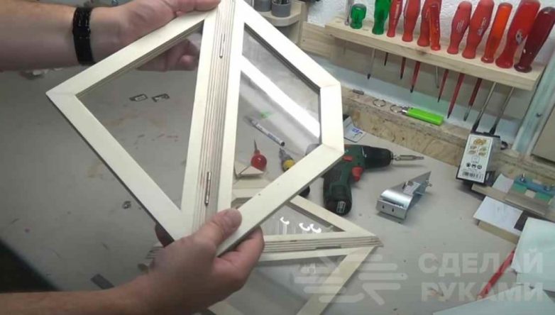 Первым делом необходимо будет сделать каркас дверцы. Он состоит из нескольких частей. Отпиливаем по размеру заготовки из фанеры, потом склеиваем детали треугольной и трапециевидной формы.