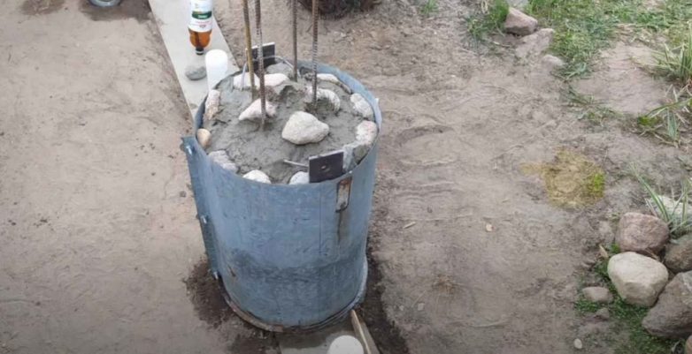В том месте, где заливались бетонные сваи, устанавливается по уровню металлическая опалубка круглой формы.