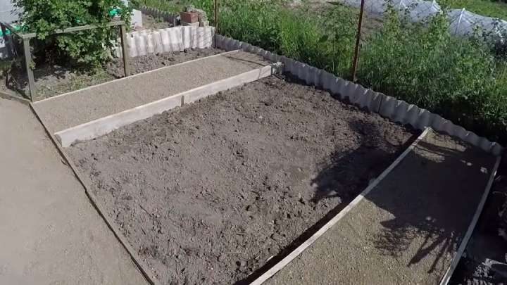Затем разметьте будущие дорожки, выложите их досками 10 см. Ширина дорожки, чтобы проезжала тачка, — 70 см.